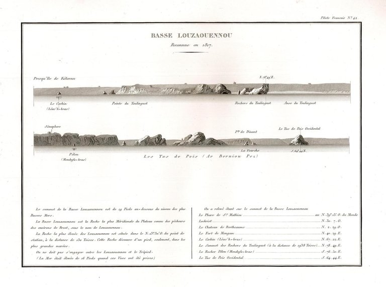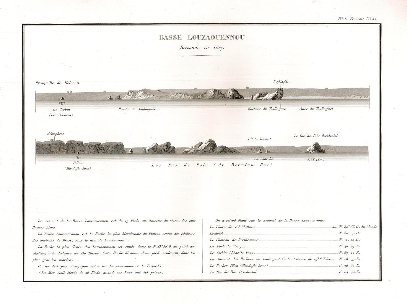 Incisione, antica ed originale, raffigurante le coste del nord-ovest della Francia nel litorale della Bretagna nei pressi di Brest in particolare: Pointe du Toulinguet, Les Tas de Pois. Inserita nell’opera di Beautemps Beaupré Charles François (considerato il padre della idrografia moderna) “Pilote français, (environs de Brest) / Rédigé / Par M. Beautemps Beaupré Ingénieur Hydrographe en Chef de la Marine, / Membre de l’Académie Royale des Sciences de l’Institut de France… / Publié par ordre du Roi / Sous me Ministère de Son Excellence M.le Marquis de Clermont Tonnerre /.“ Edita a [Parigi]