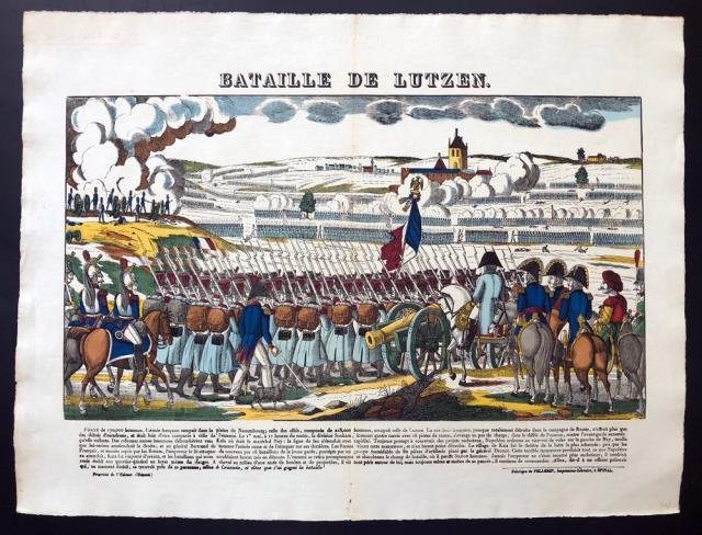 Epinal, Jean Charles Pellerin, seconda metà del XIX secolo (1877 circa). Incisione su legno in coloritura d'epoca, cm 48 x 63 circa (il foglio). La veduta è stata incisa dal Georgin e stampata dal Pellerin, il più importante editore di Epinal, cittadina del dipartimento dei Vosgi, nella regione della Lorena. Al margine inferiore la didascalia descrittiva dell'episodio: la battaglia di Lutzen, combattuta tra i francesi e la coalizione franco – prussiana. Piega centrale editoriale, bella coloritura e ottima conservazione.