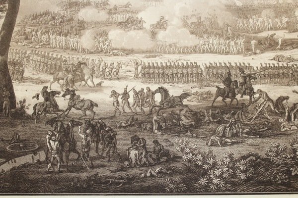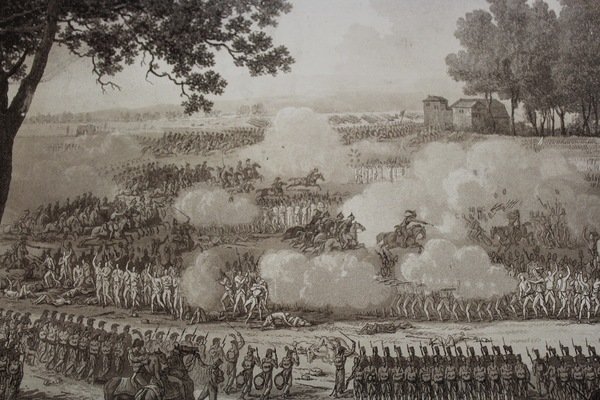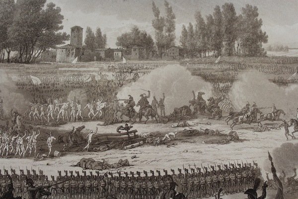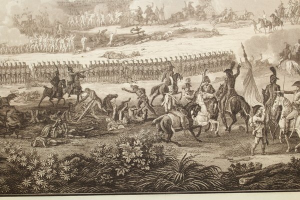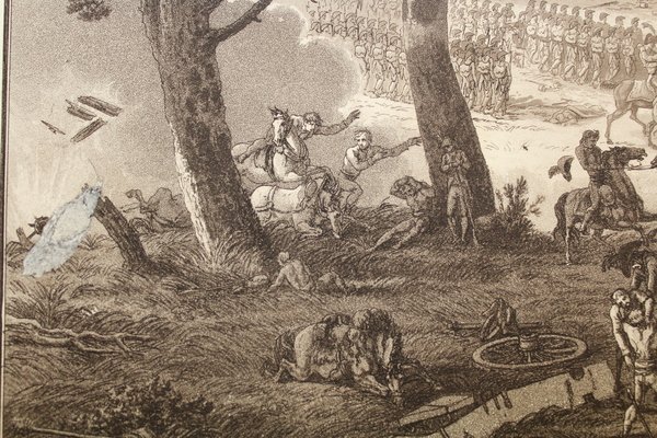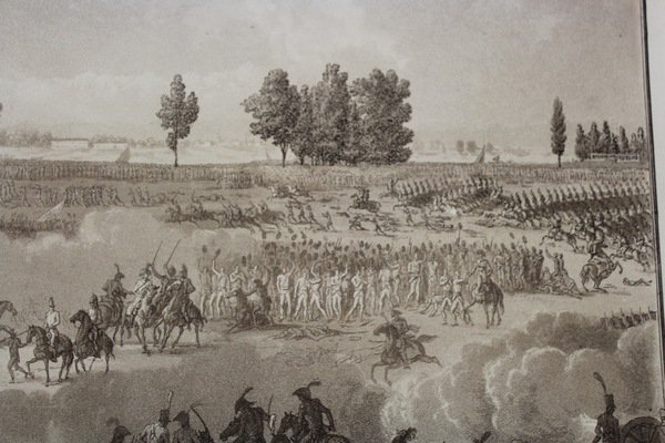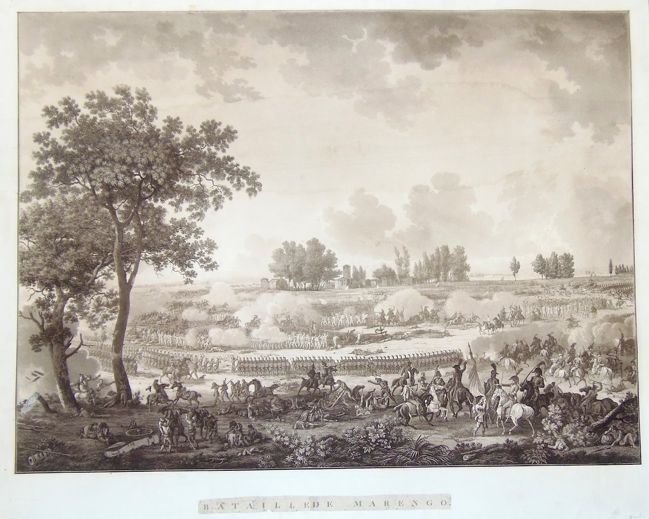 Acquatinta stampata in inchiostro seppia, mm 545x730. Incisione di grande formato, molto rara, in una qualitativa prova "ante litteram" priva delle usuali indicazioni editoriali, che riporta un titolo francese tagliato ed incollato sul margine, non necessariamente derivante da un altro esemplare della medesima stampa. Ottimo esemplare marginoso con qualche strappo ai margini ed una mancanza all'angolo inferiore sinistro nell'incisione. Sconosciuta a Portinaro-Bianchi "Alessandria nelle antiche stampe"<BR><BR>