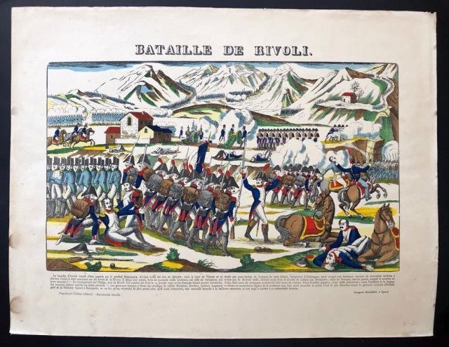 Epinal, Jean Charles Pellerin, 1900 circa. Incisione su legno in coloritura d'epoca, cm 50 x 65 circa (il foglio). La veduta è stata incisa dal Georgin e stampata dal Pellerin, il più importante editore di Epinal, cittadina del dipartimento dei Vosgi, nella regione della Lorena. Al margine inferiore la didascalia descrittiva dell'episodio: la battaglia di Rivoli Veronese, combattuta nel gennaio del 1797 fra l'esercito francese di Napoleone Bonaparte e l'esercito austriaco in Italia, confermò la definitiva vittoria francese nell'italia settentrionale. Piega centrale editoriale, alcune macchie al margine laterale sinistro, peraltro in bella coloritura e ottima conservazione.