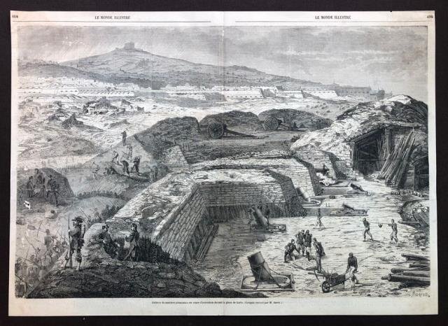 1865 circa. Tratta da “Le Monde Illustré”, Paris, 1860 circa. Incisione su legno, b/n, cm 36,5 x 52. Bella e grande veduta militare dell’Assedio di Gaeta, avvenuto tra il 5 novembre 1860 e il 13 febbraio 1861, fu uno degli ultimi fatti d'armi delle operazioni di conquista dell'Italia Meridionale nel corso del Risorgimento italiano. Usuale ingiallimento con un paio di mancanze della carta ai margini laterali ma molto ben conservata. .