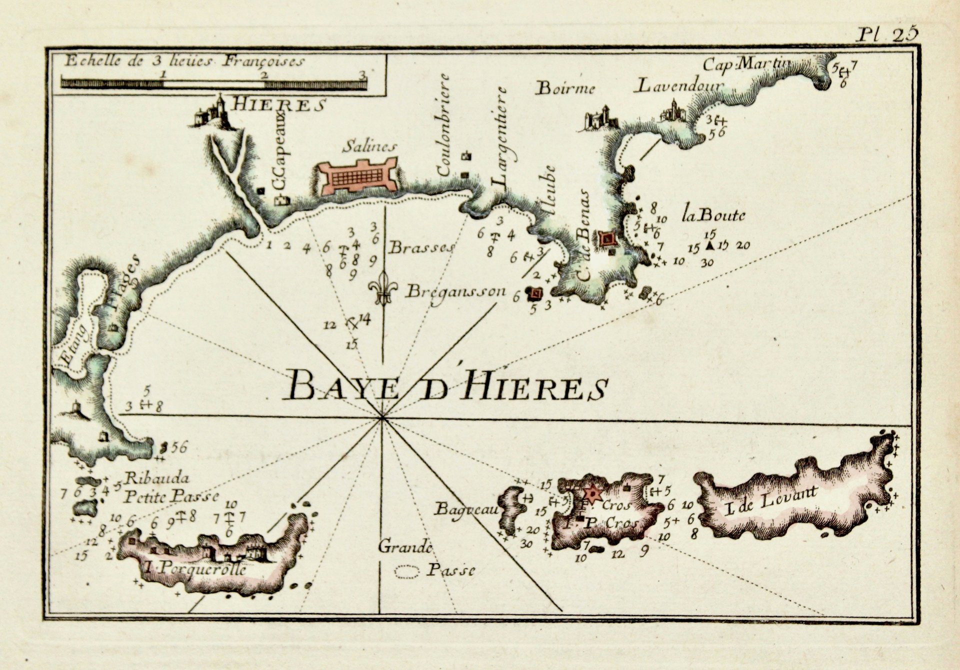 Incisione in rame, mm 130x200, dipinta a mano, tratta da «Recueuil des Principaux Plans des Ports et Rades de la Mer Mediterranee». Joseph Roux (1725-1793) è stato un celebre cartografo francese. Nel 1764 egli pubblicò un atlante del Mediterraneo in 12 grandi tavole, da cui nello stesso anno trasse l’atlante dei porti. Ottimo esemplare.