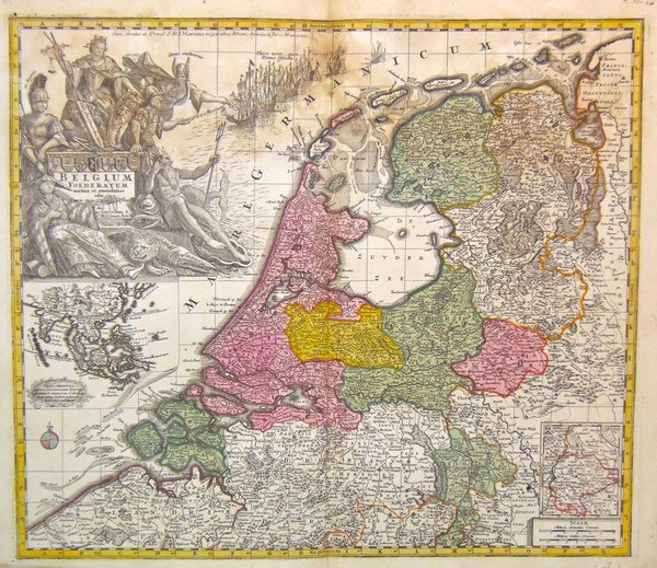 Incisione in rame, coloritura originale d'epoca con ricco e fascinoso cartiglio in bianco nero, riquadri in basso rispettivamente a sinistrae a destra con le Indie Orientali e la contea di Limburgo. Mm 482x565. Raffigura i Paesi Bassi-Olanda. Seutter, dopo un apprendistato presso Homann a Norimberga, trasferitosi ad Augsburg verso il 1720, aprì la propria attività superando il maestro sotto il profilo della bellezza: le sue carte hanno sempre colori brillanti e cartigli elaborati. Bell' esemplare con una lieve ossidazione in alto alla piega centrale. Copperplate, original colour, mm 482x565. Good example in fine colour, some waterstain at center. Seutter, after having worked with Homann in Nuremberg, opened his own activity in Augsburg around 1720. His maps always have elaborate cartouches and are very decorative and printed on good paper.
