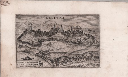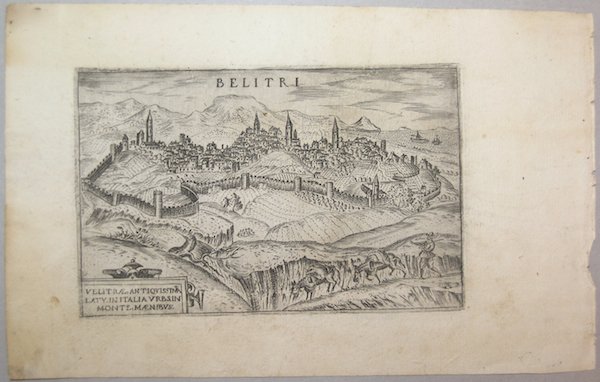 Veduta tratta dalla serie La Raccolta di le piu illustri et famose citta di tutto il mondo, edita da Francesco Valegio a Venezia verso la fine del’ 500, che comprende circa 322 piante e vedute delle principali città del mondo conosciuto. Di questo volume, si conservano diversi esemplari, tutti con numero variabile di incisioni e privi di un indice a stampa. Inoltre, gran parte delle tavole contenute nella raccolta del Valegio furono inserite nella Nuova raccolta di tutte le più illustri et famose città di tutto il mondo, curata da Donato Rasciotti, edita alla fine del sedicesimo secolo. Tuttavia, è persino incerto quale delle due raccolte venne per prima alla luce ed ignote sono le datazioni di tutte le tirature conosciute. Francesco Valegio nasce a Bologna circa nel 1560, anche se alcuni studiosi gli accreditano un’origine veronese; la sua attività di incisore ed editore calcografo si svolge tutta a Venezia, spesso in associazione con altri stampatori. Le tavole che compaiono nelle Raccolta, che senza dubbio possiamo considerare come la sua opera più importante, sono tutte prive di data, ad eccezione di quelle di Algeri, Costantinopoli e Rodi, firmate da Martino Rota, datate 1572. Le piante e le vedute firmate dal Rota, incisore nativo di Sebenico e attivo a Venezia fino al 1573, costituiscono, senza dubbio, il nucleo più antico dell’opera e fanno ritenere che questa sia stata un progetto editoriale iniziato proprio dall’incisore dalmata. In un primo momento, la presenza di queste tavole aveva portato a datare l’opera al 1579, data che sembra tuttavia molto improbabile. Molte delle immagini riprendono modelli figurativi apparsi nei primi volumi del Civitates Orbis Terrarum, editi tra il 1572 ed il 1588 (e successivamente ristampati sino al 1617) dai cartografi Georg Braun e Franz Hogenberg. Pertanto, è molto più plausibile che il Valegio iniziò verso il 1580 ad osservare le tavole incise da Martino Rota, per poi ampliare e pubblicare la raccolta, nell’ultimo ventennio del secolo. Dell’intero corpus di incisioni che compongono l’opera, 112 recano la firma o la sigla del Valegio, altrettante sono assimilabili alla mano dello stesso, mentre 69 sono ascrivibili ad altro artista, non identificato. ' La Raccolta ebbe un grande successo, tanto che fu la base di diverse copie nei secoli successivi. I rami del Valegio furono in seguito ristampati da Raffaello Savonarola (Lasor a Varea) nel Universus Terrarum Orbis del 1713. Il gruppo di 52 tavole riguardanti la penisola, che di seguito presentiamo, costituisce l’intero corpus di immagini dell’Italia, ad eccezione delle piante di Ascoli e Ferrara, mancanti; un elemento particolare, che caratterizza i fogli, è la presenza di un numero progressivo (da 1 a 60) ad inchiostro antico, posto nel margine bianco superiore. Pertanto, si può supporre che questi esemplari provengano dalla Raccolta delle più famose Città di Italia, che il Valegio creò alterando semplicemente il frontespizio della precedente pubblicazione. ' Incisione al bulino, con margini, in ottimo stato di conservazione. Molto rara. View taken from La Raccolta di le piu illustri et famose citta di tutto il mondo, published by Francesco Valegio in Venice towards the end of the XVI century, containing about 322 plans and views of the main cities of the World. There are different examples of this work, every one with a different number of plates and without an index. Many of these plates have been afterwards included in Donato Rasciotti's Nuova raccolta di tutte le più illustri et famose città di tutto il mondo, printed at the end of the XVI century. It is still, however, quite unclear whether Valegio or Rasciotti published first his collection. Francesco Valegio was born in Bologna around 1560, even though some say he might have been born in Verona; as engraver and calcographer, he worked in Venice, very often in association with other publishers. The plates of his series, which can be considered his most important work, do not bear any date, except for those of Algeri, Costantinopoli and Rodi, signed by Martino Rota, dated 1572. The city plans signed by Rota, (engraver born in Sebenico who worked in Venice until 1573), are the most ancient core of the work, which make us think that this work has been planned by Rota himself. Many plates recall the figurative models of the Civitates Orbis Terrarum printed between 1572 and 1588 (afterwards reissued until 1617) by Georg Braun and Franz Hogenberg. It is possible that Valegio started to select the plates by Rota around 1580 and afterwards enlarged his collection at the end of the century. 112 plates bear Valegio's signature or monogram and as many can be ascribed to him; 69 have been ascribed to an unkwown artist. The collection was extremely successful and became the base for the following copies. Valegio's plate have been reissued by Raffaello Savonarola (Lasor a Varea) in the Universus Terrarum Orbis in 1 713. There are 52 plates depicting the peninsula. A distinctive element of this corpus is the presence of a number (from 1 to 60) with ancient ink, on the white upper margin; that makes us presume that these examples come from another collection of Valegio, Raccolta delle più famose Città di Italia, which he created by changing the front page of his previuos publication. ' Copper engraving, particularly rich and with good contrast, in excellent condition. ' Very rare. Cfr. Bibliografia: Almagià p. 10, Cremonini p. 15/17, Valerio p. 75/87.