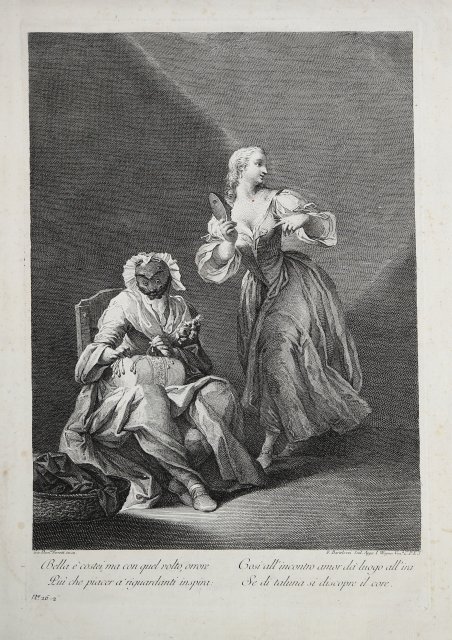 Arlecchino travestito da donna, seduto su una sedia a sinistra, che lavora a un merletto; a destra, una giovane donna in piedi, con la testa di profilo a destra, che tiene una maschera nella mano destra. Stampa da un dipinto di Giovanni Domenico Ferretti raffigurante Colombina che svela l'identità di Arlecchino. La stampa è la seconda di una serie di quattro intitolata "Le quattro arlecchinate" e fu pubblicata a Venezia da Joseph Wagner. Acquaforte e bulino, con i nomi degli artisti sotto l'immagine: "Gio. Domco. Ferretti inven. / F. Bartolozzi Scul. Appo I. Wagner Vena. C. P. E. S.", quattro righe di versi italiani che iniziano: "Invano si nasconde [.]" che termina: "[.] al viso ogni Buffone"; numerata in basso a sinistra: "N. 26-4". Magnifica impressione, stampata su carta vergata coeva, con margini, ottimo stato di conservazione. Francesco Bartolozzi, figlio di un orafo fiorentino, conosce l'incisore tedesco Joseph Wagner presso la cui bottega, la più importante di Venezia, dove si trasferisce nell'agosto del 1748. Nella città lagunare Bartolozzi rimane per sedici anni, partecipando alla vita artistica ed entrando in contatto i maggiori editori e stampatori, oltreché con uomini di cultura. Alterna opere proprie a traduzioni da altri artisti in collaborazione con Wagner, come la serie dedicata al Guercino alla quale si dedica quasi esclusivamente fra il 1761 ed il 1765. Sono questi gli anni in cui Bartolozzi diviene titolare di una propria bottega. Si trasferisce quindi in Inghilterra, dove si ferma per circa quarant'anni, e dove si dedica prevalentemente all'attività di traduzione, alternando con eguale successo l'interpretazione delle opere dei pittori celebri del passato e quella dei contemporanei. Oltre ai disegni del Guercino della collezione reale l'artista riproduce disegni dai Carracci, Pietro da Cortona, Guido Reni, Carlo Maratta e dell’amico Giovan Battista Cipriani. Bibliografia Calabi & De Vesme 1928 / Francesco Bartolozzi. Catalogue des estampes et notice biographique d'après les manuscrits de A. De Vesme entièrement réformés et complétés d'une étude critique par A. Calabi (1339.III). ' Harlequin dressing up as a woman, seated on a chair to left, working on lace; to right, a young woman standing, head in profile to right, holding a mask in her right hand. Print from a painting by Giovanni Domenico Ferretti depicting Columbine unveiling Harlequin's identity. The print is the second in a series of four entitled 'Le quattro arlecchinate', or Harlequinades and was published in Venice by Joseph Wagner. Etching with engraving, lettered below image with artists' names: "Gio. Domco. Ferretti inven. / F. Bartolozzi Scul. Appo I. Wagner Vena. C. P. E. S.", four-line of Italian verse beginning: "Invano si nasconde [.]" ending: "[.] al viso ogni Buffone", numbered at bottom left: "No. 26-2". A fine impression, printed on contemporary laid paper, with margins, very good condition. Francesco Bartolozzi, the son of a Florentine goldsmith, met German engraver Joseph Wagner at whose workshop, the most important in Venice, where he moved in August 1748. In the lagoon city Bartolozzi remained for sixteen years, participating in artistic life and coming into contact with major publishers and printers, as well as men of culture. He alternated between his own works and translations by other artists in collaboration with Wagner, such as the series devoted to Guercino to which he devoted himself almost exclusively between 1761 and 1765. These are the years when Bartolozzi becomes the owner of his own workshop. He then moved to England, where he stayed for about forty years, and where he devoted himself mainly to the activity of translation, alternating with equal success between interpreting the works of famous painters of the past and those of his contemporaries. In addition to drawings by Guercino in the royal collection, the artist reproduced drawings by the Carracci, Pietro da Cortona, Guido Reni, Carlo Maratta, and his friend Giovan Battista Cipriani. Bibliografia Calabi & De Vesme 1928 / Francesco Bartolozzi. Catalogue des estampes et notice biographique d'après les manuscrits de A. De Vesme entièrement réformés et complétés d'une étude critique par A. Calabi (1339.III). Cfr.