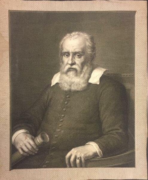 Incisione su rame, priva di margine, ma con cornicetta decorativa, in formato cm.35,5x23,3, raffigurante il grande astronomo pisano ormai vecchio, seduto, con un cannocchiale in mano, e con espressione assorta. Incisione per niente usuale, della quale non siamo stati in grado di rinvenire informazioni circa l'autore e lo stampatore, di ottimo effetto visivo. Codice libreria 160871.