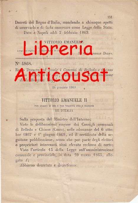 REGIO DECRETO COL QUALE I COMUNI DI BELLEDO E CHIUSO SONO RIUNITI IN UNO SOLO ASSUMENDO LA DENOMINAZIONE DALLA BORGATA MAGGIANICO Vittorio Emanuele II