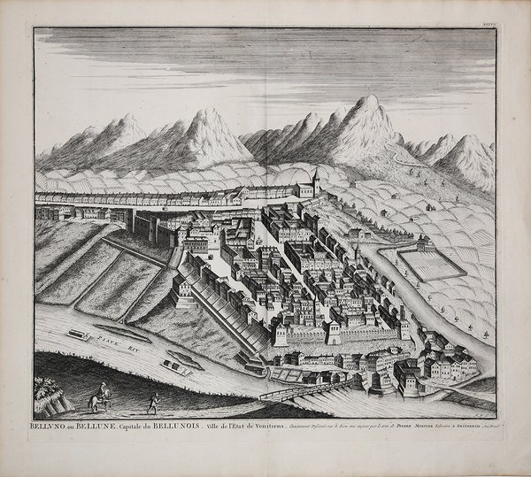 Esemplare tratto dal primo volume del "Nouveau Theatre de l'Italie" pubblicato ad Amsterdam nel 1704/5 e nel 1724, quale integrazione al progetto di Johannes Baleu, iniziato nel 1663, del grande "libro delle città", manchevole delle piante di gran parte della parte settentrionale della penisola. Il Blaeu, durante la sua lunga attività editoriale pubblica tre volumi sulle città italiane. Nel 1663 i primi tre, suddivisi in Stato della Chiesa, Roma e Regno di Napoli e Sicilia. Alla sua morte i suoi eredi danno alla luce altri due volumi datati 1682 incentrati sulle città del Piemonte e della Savoia, poi ristampati da altri editori nel 1693 e 1697. Il francese Pierre Mortier pubblica una ristampa nel 1704/5, intitolata “Nouveau Theatre de l’Italie”. L’opera è in quattro volumi e comprende le lastre del Blaeu, ritoccate e modificate in piccola parte, integrate dall’aggiunta di numerose nuove mappe di proprio disegno, raffiguranti le città della parte settentrionale della penisola, racchiuse nel primo volume dell’opera. L’atlante del Mortier venne pubblicato con testo latino, francese ed olandese. La particolarità che differenzia le due edizioni di Blaeu e Mortier è rappresentata dal fatto che il testo non è al verso della singola mappa (che quindi è bianca nel retro), ma si trova all’inizio di ogni singolo volume. Il grande successo dell’opera diede origine ad un’ulteriore ristampa, praticamente identica, curata da R. Alberts ed edita nel 1724/5. Incisione in rame, in buono stato di conservazione. Bibliografia: Cremonini pp. 83-90. View from the first volume of the "Nouveau Theatre de l'Italie", published in Amsterdam in 1704/5 and in 1724. Cfr.