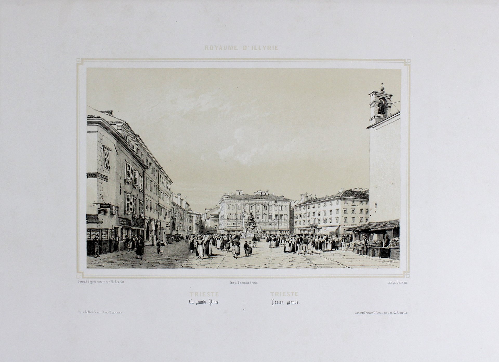 Veduta della Piazza Grande a Trieste disegnata dal vero da Philippe Benoist (1813-1888) e litografata da Charles Claude Bachelier (1834-1852) tratta dall'opera "L'Italie monumentale et artistique, vues et monuments dessinès d'après nature par Philippe Benoist et litographiès aux deux crayons par Bachelier, Philippe Benoist et Jacottet" edita da Bulla a Parigi e stampata da Lemercier nel 1845. In alto al centro: "Royaume d'Illyrie".