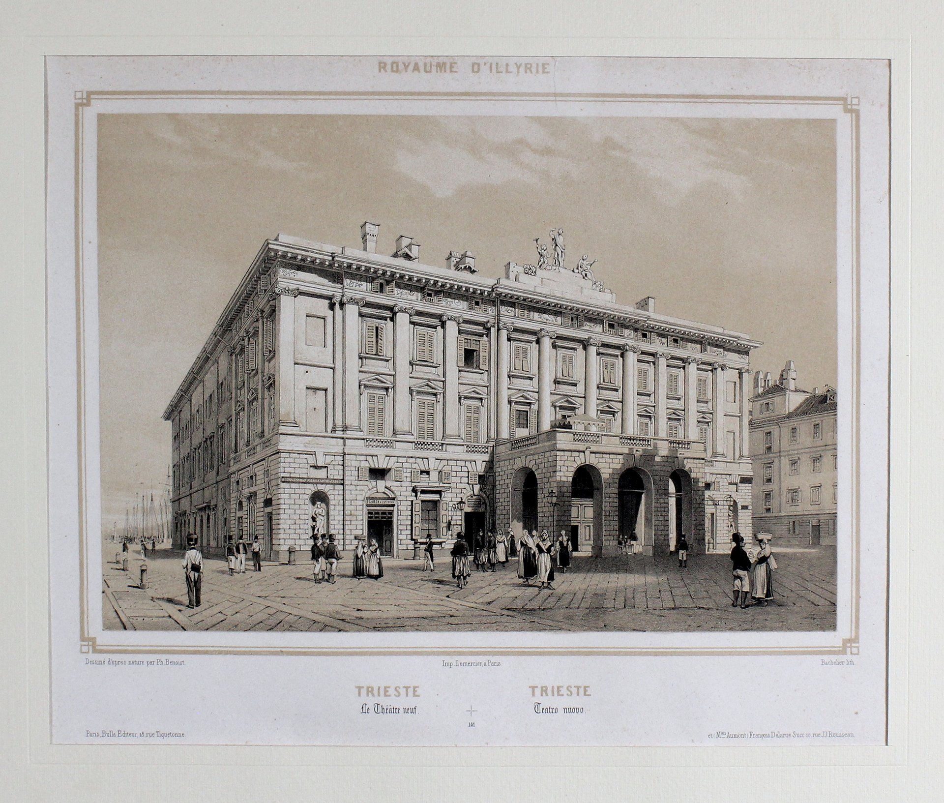 Veduta del Teatro Nuovo, oggi Teatro Verdi, disegnata dal vero da Philippe Benoist (1813-1888) e litografata da Charles Claude Bachelier (1834-1852) tratta dall'opera "L'Italie monumentale et artistique, vues et monuments dessinès d'après nature" edita da Bulla e stampata da Lemercier a Parigi nel 1845. In alto al centro: "Royaume d'Illyrie".