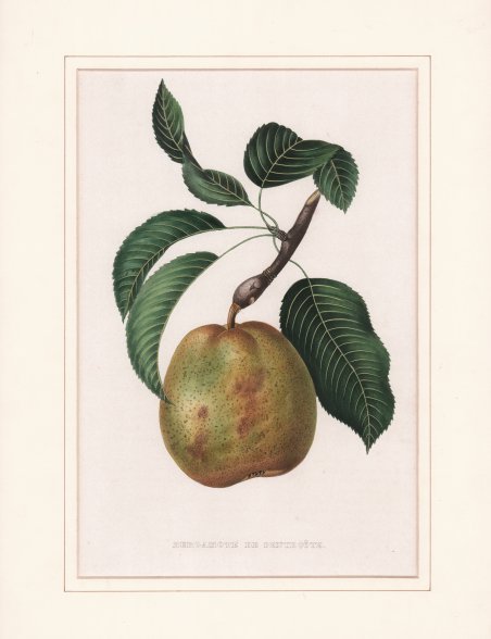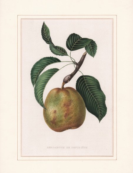 Litografia a colori, 1853-1860, impressa su carta coeva, in perfetto stato di conservazione. La tavola è tratta dagli ' Annales de pomologie belge et étrangère ' (1853-1860) una rivista illustrata di pomologia pubblicata annualmente dalla Commission Royale de Pomologie belga, con Alexandre Bivort come segretario del comitato di redazione (di fatto direttore). Fu stampato a Bruxelles, prima da F. Parent (1853-1858) e poi dalla sua vedova e dal figlio (1859-1860). ' Oltre allo stesso Bivort, contribuirono agli Annales Charles ed Ernest Baltet, Laurent de Bavay, Jules de Liron d'Airoles, Antoine-Joseph Gailly, Charles Auguste Hennau, Alfred Loisel, Auguste Royer, Félix Sahut e Michel Scheidweiler. Alexandre Joseph Désiré Bivort (1809-1872) è stato un orticoltore belga, specializzato in pomologia. Fu particolarmente influente nella sistematizzazione della nomenclatura delle varietà di pere. Educato alla scuola industriale di Melle e al collegio di Aalst, dedicò molto del suo tempo allo studio dell’agricoltura, diventando alla fine un orticoltore a tempo pieno. Nel 1840 acquistò la collezione di semi di Jean-Baptiste Van Mons, che contava circa 20.000 semi, e gradualmente la trasportò nella sua proprietà a Saint-Remy-Geest. Nel 1854 divenne il direttore della Société Van Mons. Corrispondeva con molti importanti pomologi internazionali ed era il segretario del comitato di redazione degli ' Annales de pomologie belge et étrangère ' della Commission Royale de Pomologie (1853-1860), a cui contribuì in modo sostanziale. Bibliografia Émile Rodigas, "À la mémoire d’Alexandre Bivort", Bulletins d’arboriculture, de floriculture et de culture potagère ' (1872), p. 275; Anne-Marie Bogaert-Damin, "L’illustration des revues d’horticulture en Belgique au XIXe siècle", In Monte Artium, 7 (2014), pp. 155-176. Colour litograph, 1853-1960, printed on contemporary paper, good condition. The plate is taken from ' Annales de pomologie belge et étrangère (1853–1860), an illustrated pomology review published annually by the Belgian Commission Royale de Pomologie, with Alexandre Bivort as secretary of the editorial committee (effectively editor in chief). It was printed in Brussels, first by F. Parent (1853-1858) and then by his widow and son (1859-1860). ' Apart from Bivort himself, contributors to the Annales included Charles and Ernest Baltet, Laurent de Bavay, Jules de Liron d’Airoles, Antoine-Joseph Gailly, Charles Auguste Hennau, Alfred Loisel, Auguste Royer, Félix Sahut, and Michel Scheidweiler. Alexandre Joseph Désiré Bivort (1809–1872) was a Belgian horticulturalist, specialising in pomology. He was particularly influential in systematising the nomenclature of strains of pear. He devoted much of his time to the study of griculture, eventually becoming a full-time horticulturalist. In 1840 he acquired the seed collection of Jean-Baptiste Van Mons, numbering about 20,000 seeds, and gradually transported it to his own property at Saint-Remy-Geest. In 1854 he became the director of the Société Van Mons. He corresponded with many leading international pomologists, and was the secretary of the editorial committee of the Commission Royale de Pomologie's ' Annales de pomologie belge et étrangère ' (1853–1860), to which he was a substantial contributor. Bibliografia Émile Rodigas, "À la mémoire d’Alexandre Bivort", Bulletins d’arboriculture, de floriculture et de culture potagère ' (1872), p. 275; Anne-Marie Bogaert-Damin, "L’illustration des revues d’horticulture en Belgique au XIXe siècle", In Monte Artium, 7 (2014), pp. 155-176. Cfr.