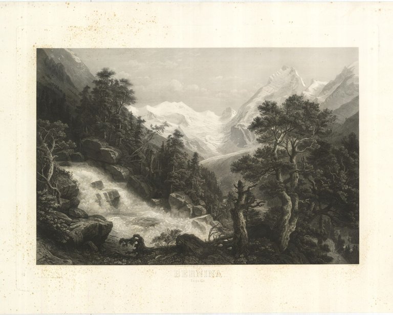 Affascinante grande veduta romantica del Bernina, edita dallo stesso Huber a Zurigo e da Stiefbold & Comp. a Berlino. Weber, "Graubunden in alten Ansichten", p. 219, n° 263