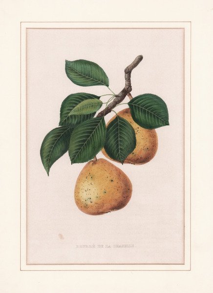 Litografia a colori, 1853-1860, impressa su carta coeva, in perfetto stato di conservazione. La tavola è tratta dagli ' Annales de pomologie belge et étrangère ' (1853-1860) una rivista illustrata di pomologia pubblicata annualmente dalla Commission Royale de Pomologie belga, con Alexandre Bivort come segretario del comitato di redazione (di fatto direttore). Fu stampato a Bruxelles, prima da F. Parent (1853-1858) e poi dalla sua vedova e dal figlio (1859-1860). ' Oltre allo stesso Bivort, contribuirono agli Annales Charles ed Ernest Baltet, Laurent de Bavay, Jules de Liron d'Airoles, Antoine-Joseph Gailly, Charles Auguste Hennau, Alfred Loisel, Auguste Royer, Félix Sahut e Michel Scheidweiler. Alexandre Joseph Désiré Bivort (1809-1872) è stato un orticoltore belga, specializzato in pomologia. Fu particolarmente influente nella sistematizzazione della nomenclatura delle varietà di pere. Educato alla scuola industriale di Melle e al collegio di Aalst, dedicò molto del suo tempo allo studio dell’agricoltura, diventando alla fine un orticoltore a tempo pieno. Nel 1840 acquistò la collezione di semi di Jean-Baptiste Van Mons, che contava circa 20.000 semi, e gradualmente la trasportò nella sua proprietà a Saint-Remy-Geest. Nel 1854 divenne il direttore della Société Van Mons. Corrispondeva con molti importanti pomologi internazionali ed era il segretario del comitato di redazione degli ' Annales de pomologie belge et étrangère ' della Commission Royale de Pomologie (1853-1860), a cui contribuì in modo sostanziale. Bibliografia Émile Rodigas, "À la mémoire d’Alexandre Bivort", Bulletins d’arboriculture, de floriculture et de culture potagère ' (1872), p. 275; Anne-Marie Bogaert-Damin, "L’illustration des revues d’horticulture en Belgique au XIXe siècle", In Monte Artium, 7 (2014), pp. 155-176. Colour litograph, 1853-1960, printed on contemporary paper, good condition. The plate is taken from ' Annales de pomologie belge et étrangère (1853–1860), an illustrated pomology review published annually by the Belgian Commission Royale de Pomologie, with Alexandre Bivort as secretary of the editorial committee (effectively editor in chief). It was printed in Brussels, first by F. Parent (1853-1858) and then by his widow and son (1859-1860). ' Apart from Bivort himself, contributors to the Annales included Charles and Ernest Baltet, Laurent de Bavay, Jules de Liron d’Airoles, Antoine-Joseph Gailly, Charles Auguste Hennau, Alfred Loisel, Auguste Royer, Félix Sahut, and Michel Scheidweiler. Alexandre Joseph Désiré Bivort (1809–1872) was a Belgian horticulturalist, specialising in pomology. He was particularly influential in systematising the nomenclature of strains of pear. He devoted much of his time to the study of griculture, eventually becoming a full-time horticulturalist. In 1840 he acquired the seed collection of Jean-Baptiste Van Mons, numbering about 20,000 seeds, and gradually transported it to his own property at Saint-Remy-Geest. In 1854 he became the director of the Société Van Mons. He corresponded with many leading international pomologists, and was the secretary of the editorial committee of the Commission Royale de Pomologie's ' Annales de pomologie belge et étrangère ' (1853–1860), to which he was a substantial contributor. Bibliografia Émile Rodigas, "À la mémoire d’Alexandre Bivort", Bulletins d’arboriculture, de floriculture et de culture potagère ' (1872), p. 275; Anne-Marie Bogaert-Damin, "L’illustration des revues d’horticulture en Belgique au XIXe siècle", In Monte Artium, 7 (2014), pp. 155-176. Cfr.
