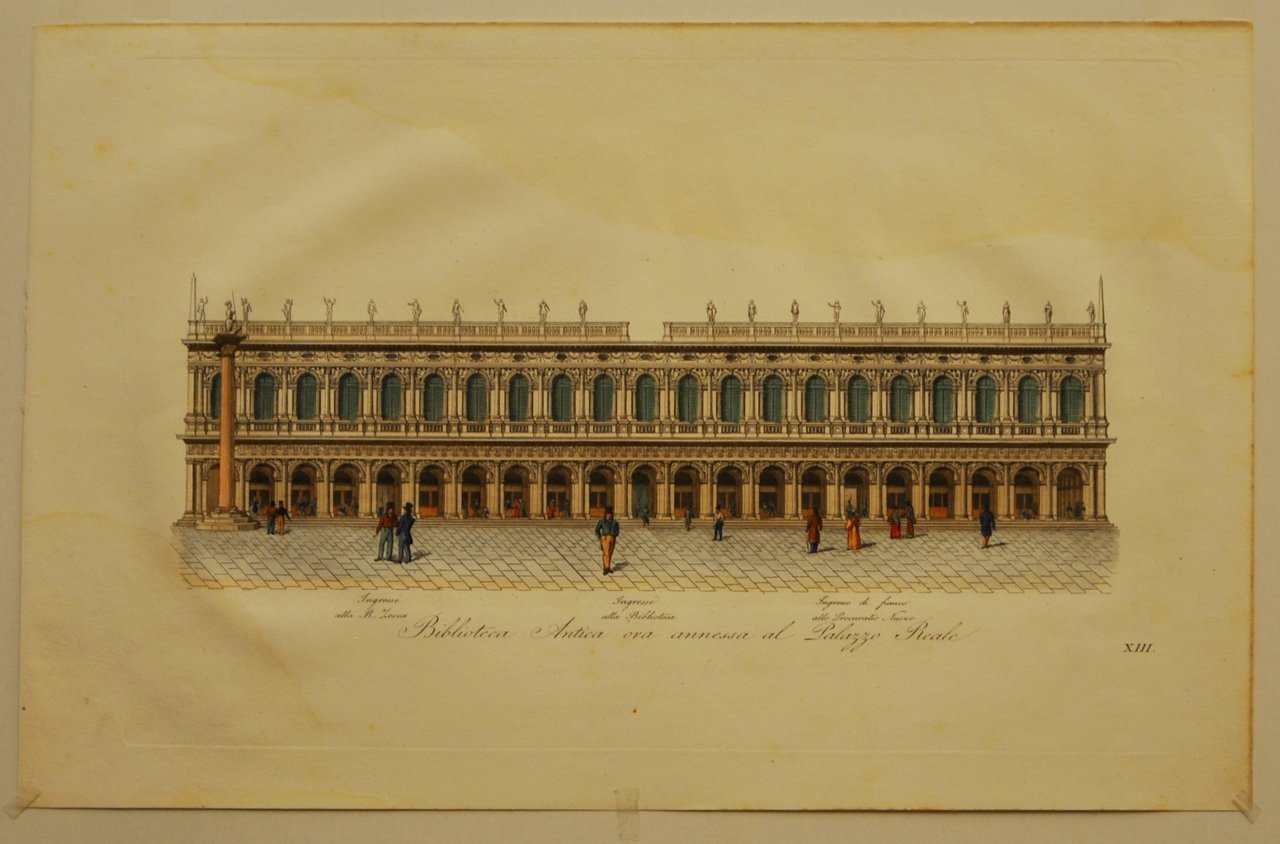 Incisione in rame in perfetta coloritura d'epoca di mm 352 x 228 alla battuta. Lievissima gora alla parte superiore. La incisione è tratta dal volume : "La Piazza di San Marco in Venezia considerata come monumento d'arte e di storia".