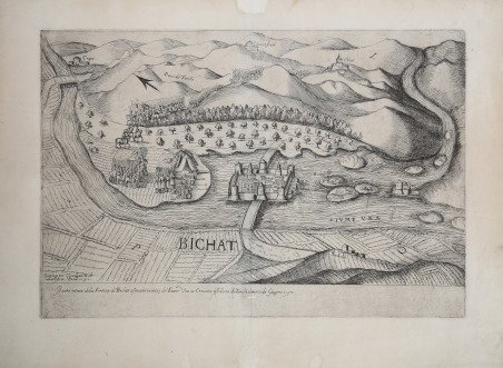 Nella parte inferiore della tavola troviamo il titolo: Il vero ritrato della Forteza di Bichat asituata in mezo del Fiume Una in Crovatia asediata da Turchi il mese de Giugno 1592. Nell’angolo in basso a sinistra si legge: Intagliata per Gioanbatista de Caualleri in Roma 1592. ' Orientazione con simboli e lettere iniziali dei venti, il nord-est è in alto. ' La pianta prospettica fu realizzata in occasione dell’assedio turco alla città di Biha? (nell’attuale Bosnia), del giugno del 1592. All’epoca, Biha? era l’ultima fortezza che l’Austria possedeva ancora sul fiume. La città cadde sotto la giurisdizione della corona, quando fu eletto re di Croazia Ferdinando d’Asburgo, nel 1527; data la sua posizione prossima al confine con i territori conquistati dai Turchi, il governatore del re pose un Capitano nella fortezza. Già dal 1591 con l’arrivo del generale Hasan Pasha Predojevi?, la tensione ai confini tra Croazia e Impero Ottomano era aumentata, nonostante l’anno precedente fosse stata rinnovata la tregua tra Rodolfo II d’Asburgo e il sultano Murad III. Hasan radunò un esercito per attaccare la Croazia; dopo il fallimentare attacco di Sisak dell’agosto del 1591, nel maggio del 1592 con un esercito di 5.000 uomini e numerosi cannoni, mosse alla volta di Biha?. La fortezza era difesa dal generale Joseph Lamberg, che aveva a disposizione un numero esiguo di soldati. Gli aiuti richiesti non arrivarono, e il 14 giugno iniziò il bombardamento della città: dopo 10 giorni di sanguinosi bombardamenti, la fortezza fu conquistata e divenne la più importante roccaforte dell’impero ottomano della Bosnia Erzegovina. Come si evince anche da questa pianta, la città era ben fortificata, con le sue doppie mura, le sue torri quadrate e circolari e la difesa naturale costituita dall’acqua del fiume Una che la circondavano. ' Giovan Battista de Cavalleris sembra essere in questo caso sia l’incisore che l’editore della lastra. Acquaforte e bulino, stampata su carta vergata coeva, con margini, in perfetto stato di conservazione. Opera rarissima conosciuta in pochissimi esemplari (cfr. Bifolco-Ronca p. 1305), Bibliografia Bifolco-Ronca, Cartografia e topografia italiana del XVI Secolo (2018): p. 1305, Tav. 570; Christie’s (2012): n. 70; Ganado (1994): VI, n. 40 & p. 210, n. 12; Tooley (1939): n. 137. A ' medium-high oblique view of the siege of the Imperial fortress of Biha? by the Turks, commanded by Telli Hasan Pasha (Hasan Predojevi?; ca 1530-22 June 1593), resulting in a Turkish victory. ' Ottoman-Habsburg Wars: The Long War (1591/3-1606). Oriented with north-east to top. Orientation is indicated by a boldly engraved arrow for north, and the letters O[riens], P[onente], and L[evante] which are written to the edges of the sheet. ' In response to the refusal by Rudolf II to pay the annual tribute to the Sultan, the Turks, commanded by Hasan Pasha, responded by taking the last imperial fortress of Biha? in June 1592. It became the westernmost Turkish acquisition, prompting the recently elected Pope Clement VIII to propose the formation of a league against the Turks. It was reported that the Turks killed 5,000 Christians and abducted 800 children when they took the city. Cfr.