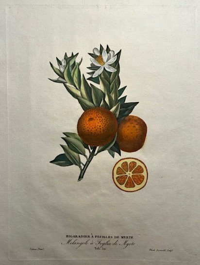 Incisione originale su rame (cm. 26x19 più ampi margini bianchi) tratta dall’ ’Histoire des Orangers’ pubblicata da Antoine Risso. Prima tiratura. Splendida coloritura all’acquerello. Ottimo esemplare.
