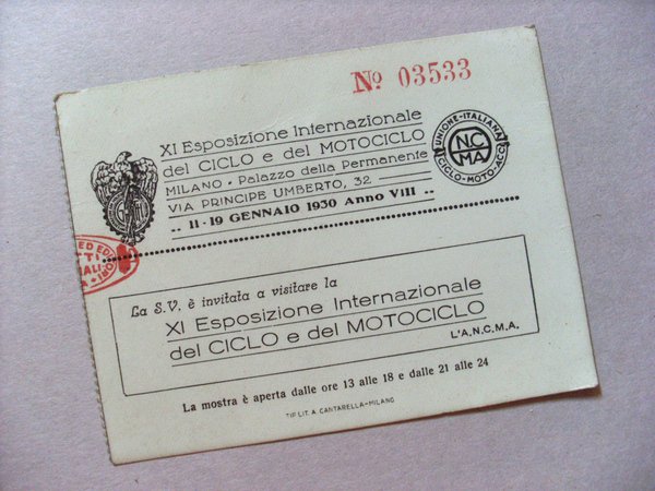 *Biglietto d´ingresso XI Esposizione Internazionale del CICLO e del MOTOCICLO. Milano 1930