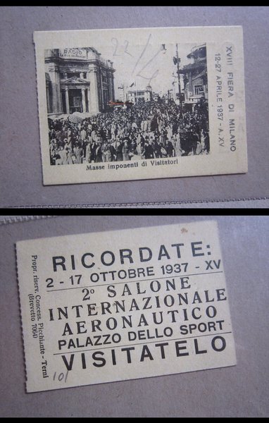 Biglietto d´ingresso XVIII Fiera di MILANO 1937. Retro pubblicità 2°Salone Internazionale Aeronautico