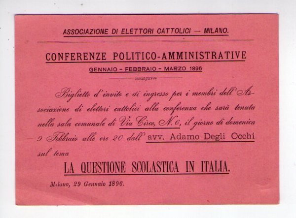 Biglietto d'invito Associazione Elettori Cattolici - MILANO "Questione Scolastica in Italia" 1896