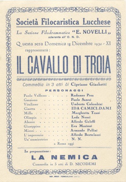 Biglietto d'invito per la rappresentazione teatrale della commedia di Cipriano Giachetti "Il cavallo di Troia" alla "Società Filocaristica Lucchese". Lucca, 18 dicembre 1932.