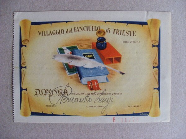 Biglietto per sorteggio / lotteria "Villaggio del Fanciullo di TRIESTE - Villa Opicina" Anni'50 (Redipuglia)