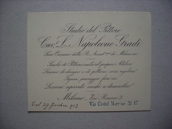 Biglietto Studio del Pittore Napoleone Gradi / Grady - Lezioni anche a domicilio. MILANO 1913