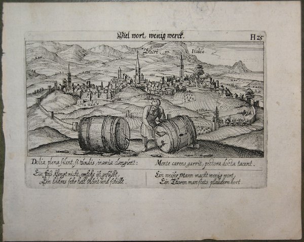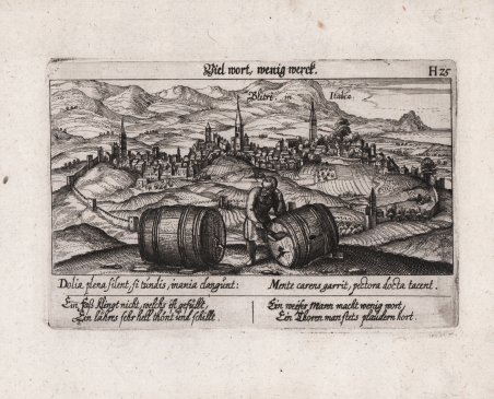 Veduta tratta dall'edizione del 1678 della celebre ' Sciagraphia Cosmica ' nota anche con il titolo ' Das ist Newes Emblematisches Buechlei, dainen in acht Centurijs die vornembste Stat, Vestung, Schlosser der ganzen Welt. ' stampata a Norinberga. La ' Sciagraphia Cosmica, venne ampliata sotto la supervisione di Kieser dopo la morte di Meisner nel 1625, arrivando quindi ad una composizione di 800 magnifiche incisioni. ' Ogni opera è caratterizzata da un motto sopra l'immagine, e da versi emblematici (in latino o tedesco). L'opera è la combinazione di due generi allora popolari, il libro degli stemmi e il "Teatro delle città". Tra i maestri incisori e miniatori che contribuirono a questa serie ci sono Matthäus Merian, Sebastian Furck, Christian Stimmer e forse anche Meisner stesso, che concepì l'opera e contribuì a buona parte della prosa. ' Incisione in rame, con margini, in perfetto stato di conservazione. View taken from the 1678 edition of the famous ' Sciagraphia Cosmica ' also known with the full title ' Sciagraphia Cosmica: ' Das ist Newes Emblematisches Buechlei, dainen in acht Centurijs die vornembste Stat, Vestung, Schlosser der ganzen Welt. printed in Nuremberg. The ' Sciagraphia Cosmica, was expanded under the supervision of Kieser after the death of Meisner in 1625, thus arriving at a composition of 800 magnificent engravings. ' Each engraving is characterized by a motto above the image, and by emblematic verses (in Latin or German). The work is a combination of two then-popular genres, the book of coats of arms and the "Town Book". Among the master engravers and illuminators who contributed to this series are Matthäus Merian, Sebastian Furck, Christian Stimmer, and perhaps Meisner himself, who conceived the work and contributed much of the prose. ' Copperplate engraving, with margins, in perfect condition. Cfr. Cremonini pagg. 57/58, 45a.
