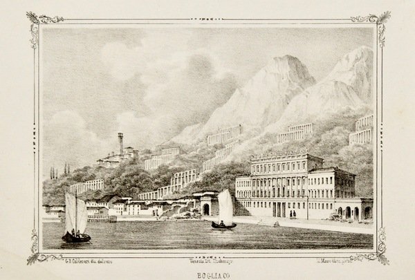 Litografia di mm 140x180, incisa da Marco Moro su disegno del Calderari. La tavola appartiene all'opera "Viaggio da Desenzano a Trento" di Ignazio Puecher-Passavalli, pubblicato a Milano nel 1844. Ottimo esemplare.<BR>Spini, Il Garda nelle stampe, pag. 134, n° 145.<BR>