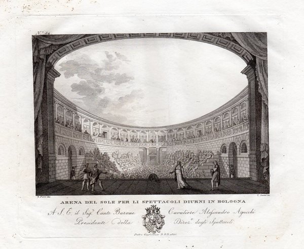 BOLOGNA – “Arena del Sole per li spettacoli diurni in Bologna” G. Ferri dis. - C. Savini inc. Veduta dell'Arena del Sole, teatro per gli spettacoli diurni quando ancora era a cielo aperto.