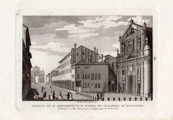 BOLOGNA - "Chiesa di S. Benedetto e Porta di Galiera in Bologna" F. Franceschini inc. Animata veduta cittadina con la porta lungo l'asse prospettico.
