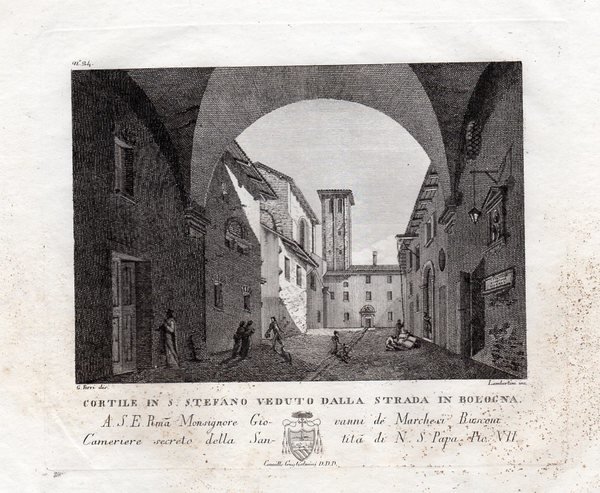 BOLOGNA – “Cortile in S. Stefano.” G. Ferri dis. – Lambertini inc. Veduta di un cortile su strada Santo Stefano, non più esistente. Si vede il campanile e parte di una delle Sette Chiese, il complesso di Santo Stefano.