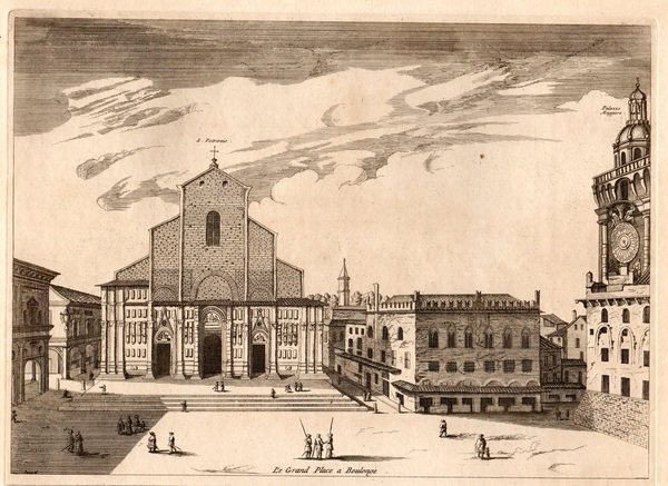 BOLOGNA - MORTIER, Pierre. 1724. "La Grand Place a Boulonge" "Splendida veduta della Piazza Maggiore di Bologna, con San Petronio e il Palazzo dei Notai visti frontalmente, in lembo di Palazzo comunale scorciato sulla destra.