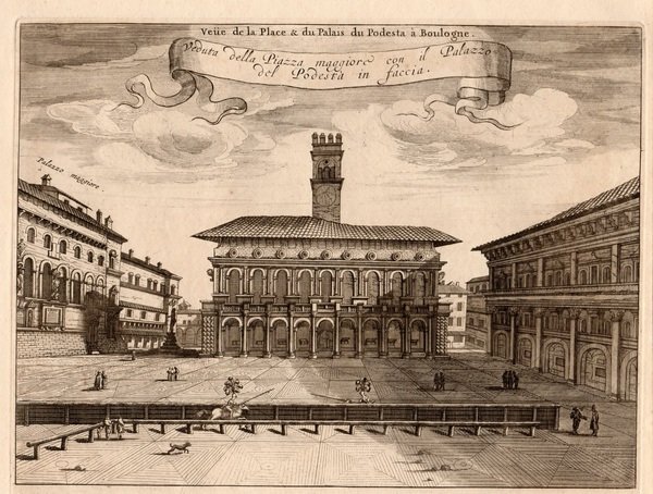 BOLOGNA - MORTIER, Pierre. 1724. "Veduta della Piazza Maggiore con il Palazzo del Podestà in faccia" "Veue de la Place & du Palais du Podestà à Boulogne" Magnifica veduta frontale del Palazzo del Podestà di Bologna, scorciati lateralmente si vedono il palazzo Comunale e il Pavaglione.