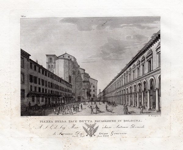 BOLOGNA – “Piazza della Pace detta Pauaglione in Bologna” G. Ferri dis – B. Rosaspina in. Bella veduta del Pavaglione sulla destra e dell'abside di San Petronio. Animata da cittadini e figure.