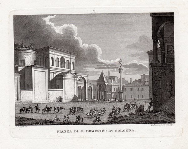 BOLOGNA - "Piazza di S. Domenico in Bologna"G. Canuti dis. - F. Franceschini inc. 1820. Animata veduta della piazza, con gendarmi, cavalli e l'Arca.