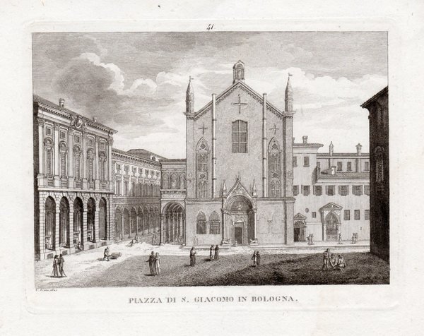 BOLOGNA - "Piazza di S. Giacomo in Bologna" C. G. inc. 1821. Bello scorcio cittadino con facciata della Chiesa di San Giacomo, l'attuale conservatorio e Via Zamboni sulla sinistra.