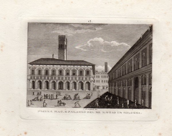 BOLOGNA - "Piazza Mag. e Palazzo del Re Enzio in Bologna" P. Romagnoli inc. Animata veduta cittadina con il Palazzo Re Enzo frontale e il Pavaglione a destra, scorciato.