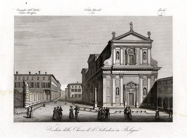 BOLOGNA - Veduta della Chiesa di San Salvatore in Bologna. Bello scorcio cittadino con passanti.