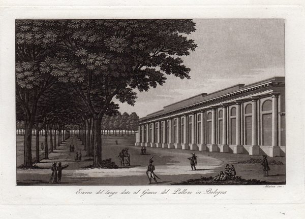 BOLOGNA -Esterno del luogo dato al giuoco del pallone in Bologna". Veduta dello Sferisterio con i giardini della montagnola sulla sinistra.