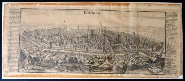 Tratta dal "Curioses Staats und Kriegs Theatrum Dermahliger Begenheiten durch Unterschiedliche Geographische, Hydrographische, Topographische, Chronolgische, Genealogische, Historische & C. Title Page Engraving", Augsburg 1720 circa. Incisione in rame all'acquaforte, cm 19,5 x 46,5 (il foglio). Gabriel Bodenehr (1664 - 1758). Non comune veduta a volo d'uccello della città di Bologna, animata da figure in primo piano, da una descrizione sulla sinistra del foglio e da una legenda a 30 voci sulla destra; in basso a destra, in lastra, "G. Bodenehr fec. et exc. A. V." Esemplare in stretti margini (è a filo di margine l'inchiostratura della descrizione sulla sinistra), segni di vecchio nastro marginali, una mancanza dell'angolo in basso a destra (che possiamo agevolmente reintegrare), sano e in buona impressione tutto l'inciso.