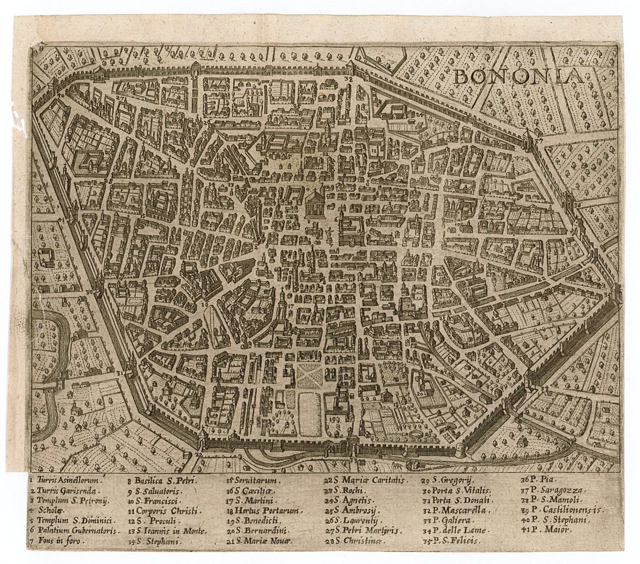 Pianta planimetrico prospettica della città di Bologna. Il titolo compare in campo libero, nell'angolo in alto a destra. In calce rimandi ai luoghi notabili della città suddivisi in sei colonne. Piega editoriale. Margine destro ridotto, intervento di restauro al margine sinistro, ma ottima impressione.
