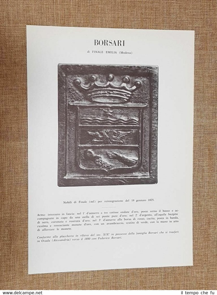 Rara tavola estratta da pubblicazione di metà '900 Stampata su carta speciale non retroscritta Borsari di Finale Emilia (Modena) Presente dettagliata storia dell'illustre Famiglia e Analitica descrizione dell'arma Stemma Famiglia Nobile Nobiltà Araldica Dimensioni: Cm 22,00 x 30,00 Codice prodotto: II1885-096 Qualora vogliate delle scansioni migliori contattateci, soddisferemo ogni vostra richiesta. Paypal Carta di credito Bonifico bancario Accuratamente adagiate su un cartoncino e protette da pellicola trasparente rigida, il tutto viene inserito dentro plico di adeguate dimensioni per proteggerne l'integrità.