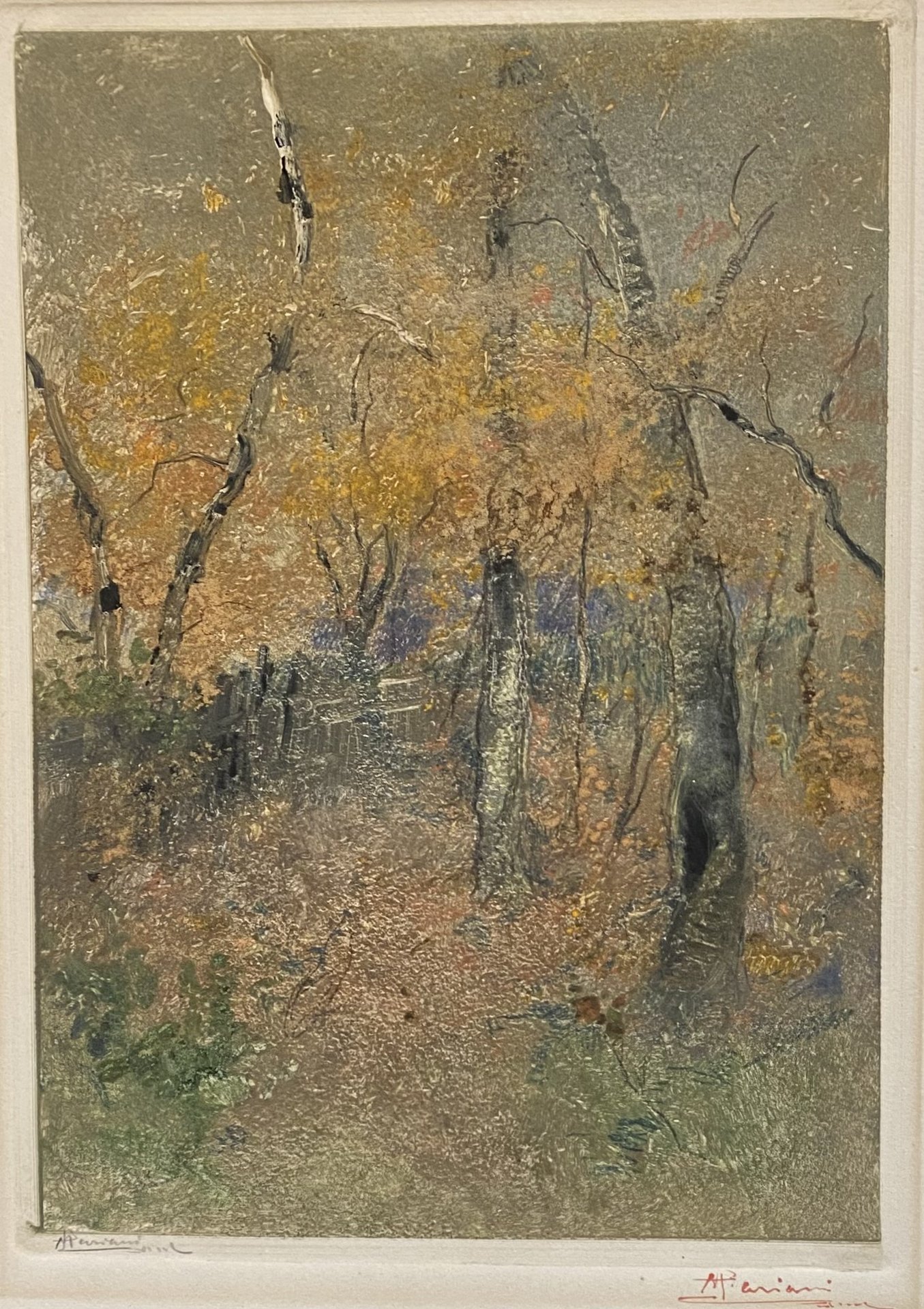 Splendido esempio della ricca produzione di monotipi di Pompeo Mariani, un aspetto della sua produzione che non ha ancora avuto uno studio sistematico. Si tratta probabilmente di una veduta del Parco di Monza, soggetto frequentemente ritratto dall'autore che si inserisce nella tradizione dei pittori lombardi. Interventi manuali a grafite e matite colorate. Firma a matita a sinistra sotto l'inciso e a penna rossa a destra. Al verso firma manoscritta della collezione Marià Elvira Celia Mendez de Bernasconi (Buenos Aires 1927- 2005), Lught 5374.