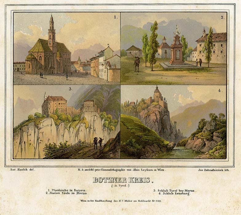Cromolitografia di dimensioni 125x180 mm. Condizioni : USATO - Stato : Buono, ordinari segni d'uso e del tempo. Alcuni segni di foxing. Altre note : Il foglio raggruppa quattro vedute bolzanine, suddivise in riquadri. Dall'alto a sinistra vediamo la parrocchiale di Bolzano (oggi il duomo), la Mariensäule (colonna di Maria) a Merano, castel Tirolo sempre vicino a Merano e infine castel Zeno. Si trova in "Der Kreis an der Etsch" di Franz Carl Weidmann, edito a Vienna (1840-1845).