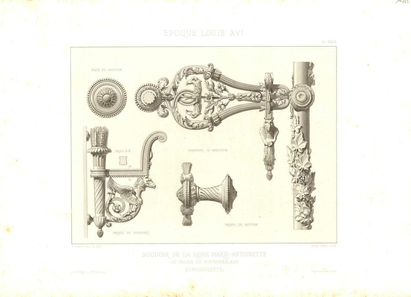 Incisione, antica ed originale, riproducente architetture all'Epoque de Louis XVI re di Francia dal 1774 al 1792. Autore: Pfnor M. Rodolphe delineò & diresse. Luogo: Fontainebleau Palazzo. Anno: 1865. Tecnica: incisione su lastra di rame. Dimensioni: 360x510 mm il foglio.