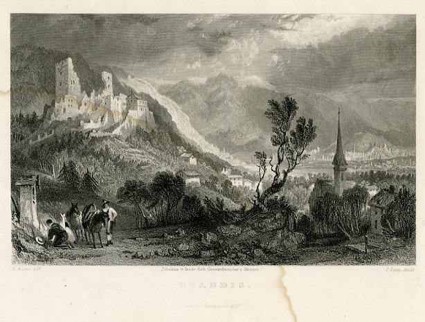 Incisione su acciaio di dimensioni 95x150 mm. Condizioni : USATO - Stato : Buono, ordinari segni d'uso e del tempo. Gora d'acqua nell'angolo inferiore sx. Altre note : Le rovine del castello di Brandis presso Lana di Sotto in Alto-Adige sono il soggetto principale di questa stampa, che si trova probabilmente in "Views in the Tyrol from drawings by T. Allom after original sketches by Johanna v. Isser geb. Grossrubatscher". Nel primo piano sulla sinistra due viandanti sono intenti a pregare presso un'edicola votiva, mentre un terzo li attende badando ai cavalli.