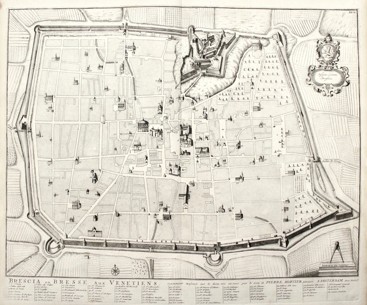 Incisione in rame, colorata, mm. 480x580.<BR>Pianta della città con innalzamento degli 83 luoghi riportati nella legenda posta in basso. Buon esemplare con qualche strappetto marginale restaurato. Sinistri, Brescia nelle stampe, 97. <BR>