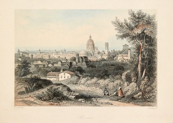 Incisione in acciaio, stampata a colori, 145x213. Bella veduta generale della città dalla collina. Ottimo esemplare.