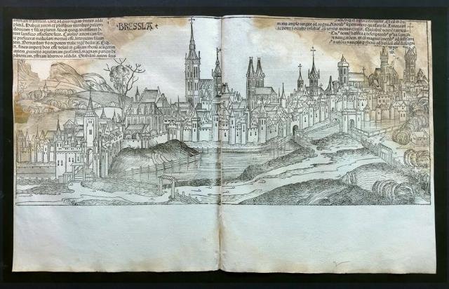 Dal “Liber Chronicarum Nurembergensi”, Anton Koberger, Norimberga, 1493. Xilografia stampata su doppia pagina, b/n, cm 31,5 x 52,5 circa (il foglio), al verso del foglio quattro figure (tra cui Santa Caterina da Siena), testo in latino. La monumentale opera dello Schedel, il "Liber Cronicarum", rappresenta uno “dei più straordinari lavori mai realizzati” dall’editoria del XV secolo. Difetti del foglio nella parte superiore, visibili al recto e al verso, sono stati riparati in modo non professionale, margini del foglio rifilati con mancanza della parte testuale ma presente la filettatura di inquadratura della veduta. Un buon oggetto da arredo con il pregio dell’antico.