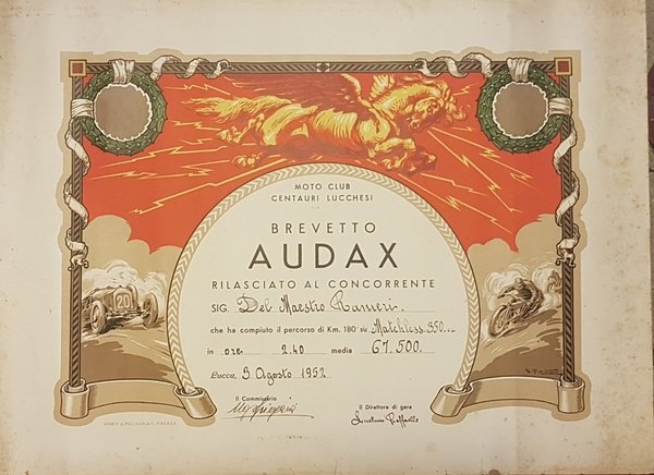 Brevetto Audax" rilasciato al concorrente Del Maestro Ranieri che ha compiuto il percorso di km.180 su "Matchless 350 cc." in ore 2,40, media 67,500. Lucca, 3 agosto 1952. Brevetto a stampa, in gradevole policromia, compilato a mano.